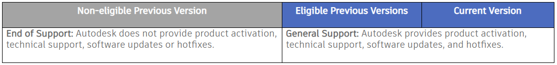 Kõigil Autodeski lepingulistel partneritel on võimalik kasutada hetkel kehtivast varasemaid versioone, millele Autodesk annab ametlikku tuge. Reeglina antakse tuge kuni 3 aastat varasematele verioonidele. Vaata siit nimekirja varasematest toodetest, mida Autodesk hetkel ametlikult toetab.