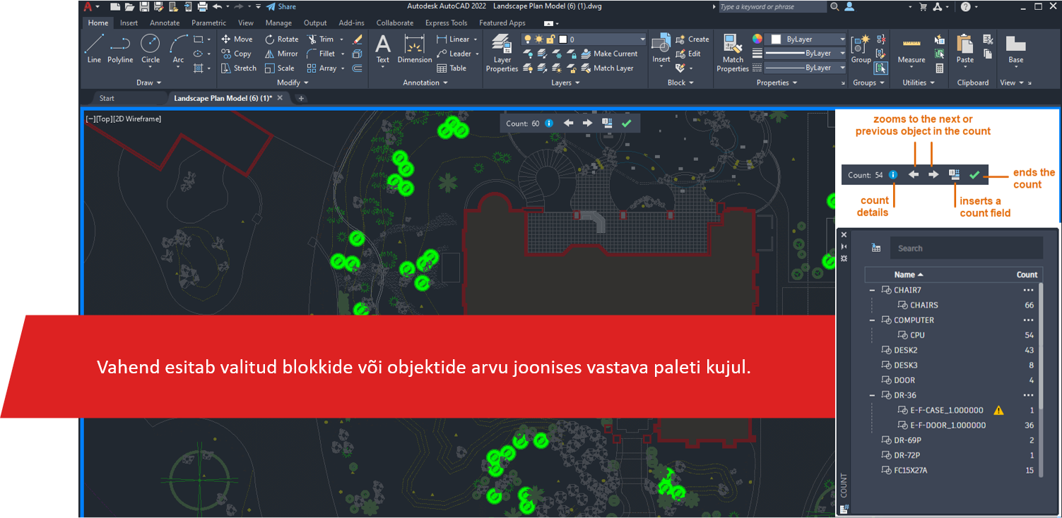 Vahend esitab valitud blokkide või objektide arvu joonises vastava paleti kujul. Käivitatakse Ribbon-i ikooni kaudu. Joonisesse võib sisestada tabeli loetlemise infoga. Aktiivne vahend kuvab joonisel count vahendiriba. Klõpsates sinisel i-sümbolil avaneb count palett.