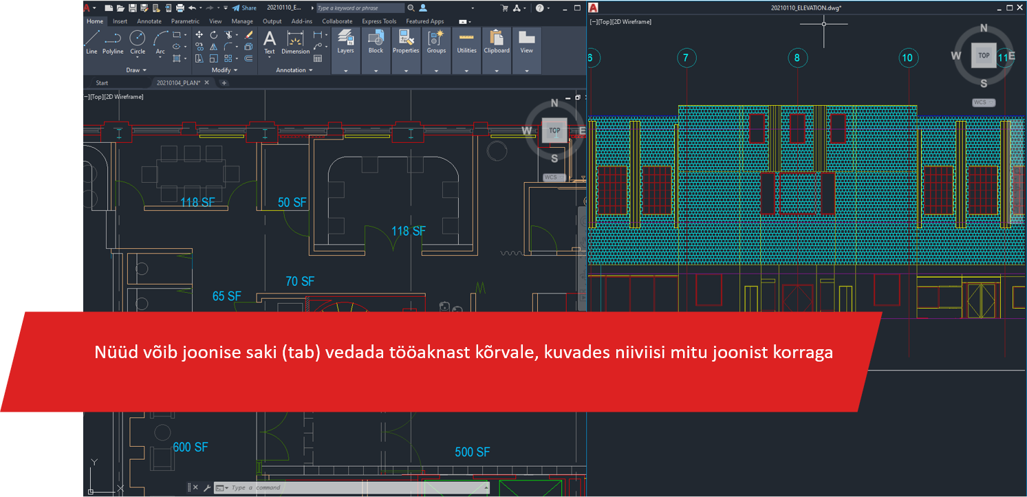Nüüd võib joonise saki (tab) vedada tööaknast kõrvale, kuvades niiviisi mitu joonist korraga. Selleks tuleb joonist vähendada ja kuvada ka jooniste sakid (File Tabs).