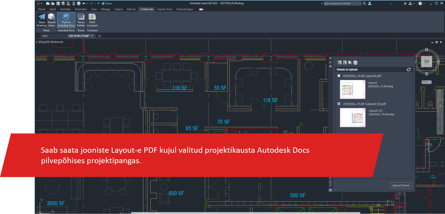Saab saata jooniste Layout-e PDF kujul valitud projektikausta Autodesk Docs pilvepõhises projektipangas. Käivitamiseks sisesta Push.