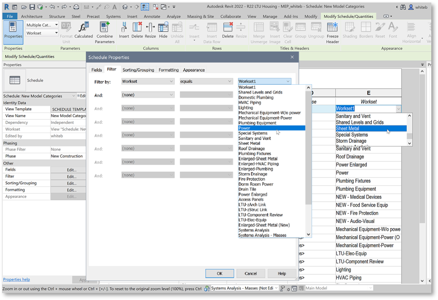Nali sai nüüd otsa ja Workset toimib tabelites nagu tavaline parameeter, spetsifitseeri ja filtreeri palju tahad.