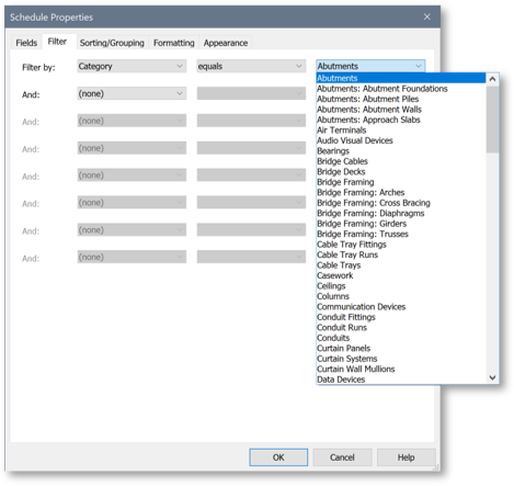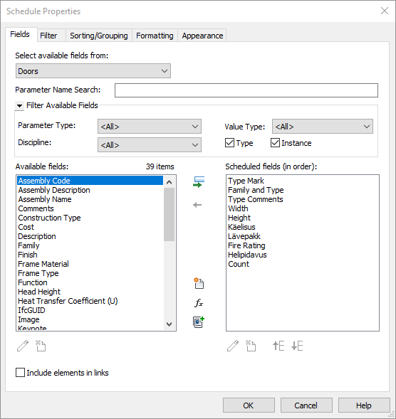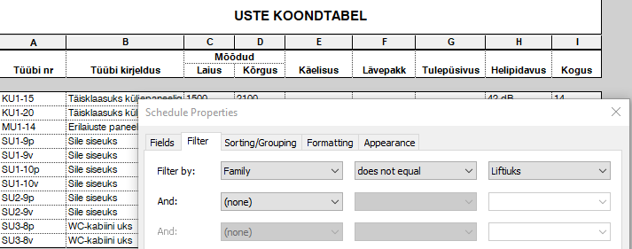 Family ja Type parameetrite kasutamine filtreerimisel (Filter Schedules by Family and Type)