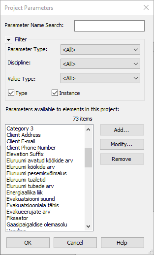 Nüüd on filtreerimine Family ja Type parameetrite põhjal võimalikuks tehtud.