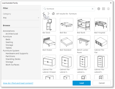 Perekondade sisselaadimiseks on olemas uus nupp “Load Autodesk Family”, mis töötab nagu sisseehitatud family manager, mis tegeleb Autodeski poolt loodud perekondade kataloogidega. Selle asemel et neid Windows Exploreriga kõvakettalt taga otsida, on need nüüd kohe Revitis paari kliki kaugusel.