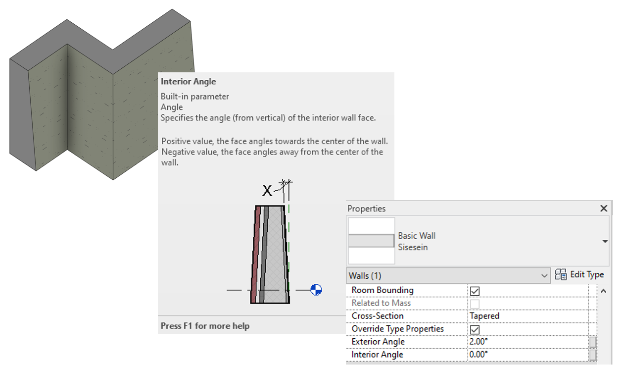 Oli kord aeg, kus kasutati veel kivikirveid ja projekteerimistarkvarades sai alt laienevaid seinu modelleerida. Aga mitte Revitis. Nüüd sõidutatakse turiste kosmosesse ning Reviti loojad on otsustanud, et on õige aeg lubada projekteerijatel modelleerida kindlusmüüre 17-ndast sajandist. Aitäh! Kasutatakse seda nii: ühele seina kihile tuleb määrata “Variable” – umbes täpselt nii nagu oleme harjunud katuste ja põrandate puhul tegema. Seejärel on võimalik määrata selle kihi välispinna ja sisepinna kaldenurk. Parameetrid võib iga üksiku elemendi puhul üle kirjutada.