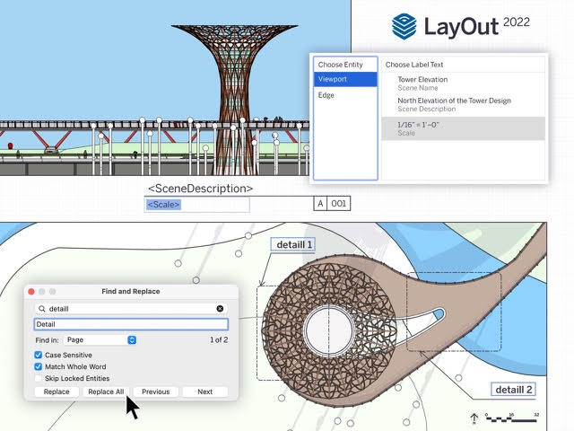 LayOutis on täiustatud funktsioone Auto-Text ja Find & Replace. Lisaks varasematele lipikutele (Labels), mis kuvavad nendel kujundite (Entity või komponentide) atribuute LayOuti vaateakende kaudu, on lisatud lipikute variant, mida saab valida Auto-Text menüüst või põhimikuna salvestatud lipikutest. Kui kasutada sellist lipikut, kuvatakse valik võimalikest parameetritest ja valitud väärtus kuvatakse lipikul automaatselt. Kasutamine on kirjeldatud täpsemalt Help Centeris.
